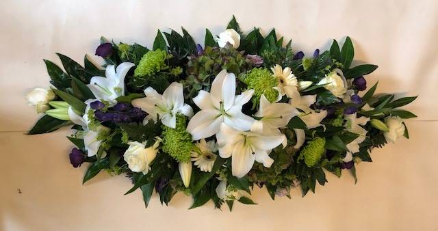 A Double Ended Coffin Spray in whites, greens and purples. Available in other colours: Pinks, whites and greens, Oranges, yellows and greens. Please contact us if you want other colour or flower options.